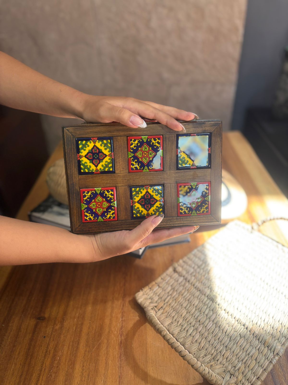Elaborado en madera de pino decorado con azulejo tipo talavera y acabado rústico con tres divisiones.