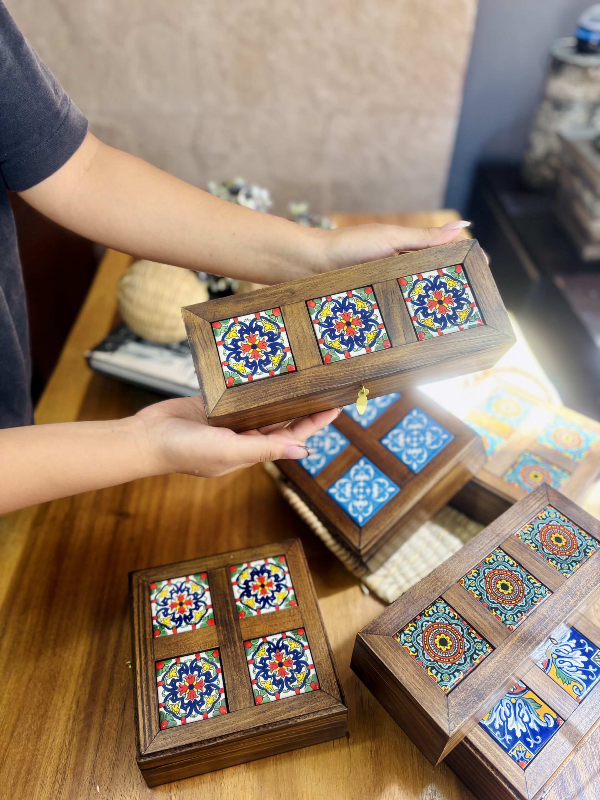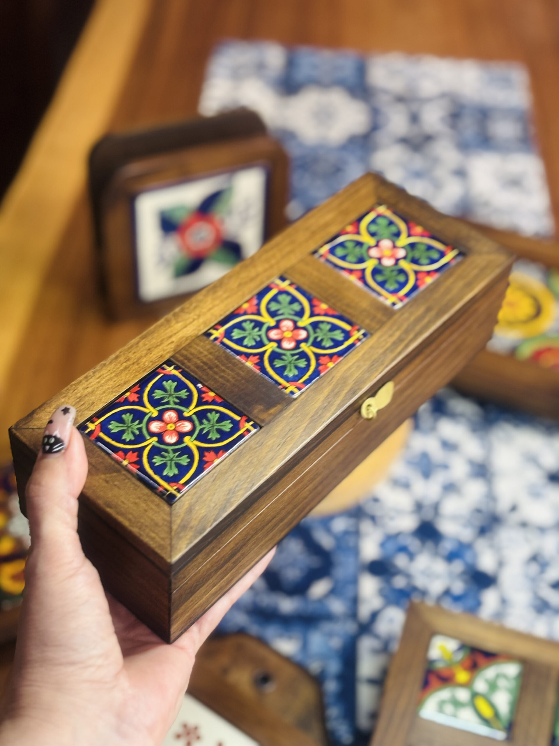 Elaborado en madera de pino decorado con azulejo tipo talavera y acabado rústico.