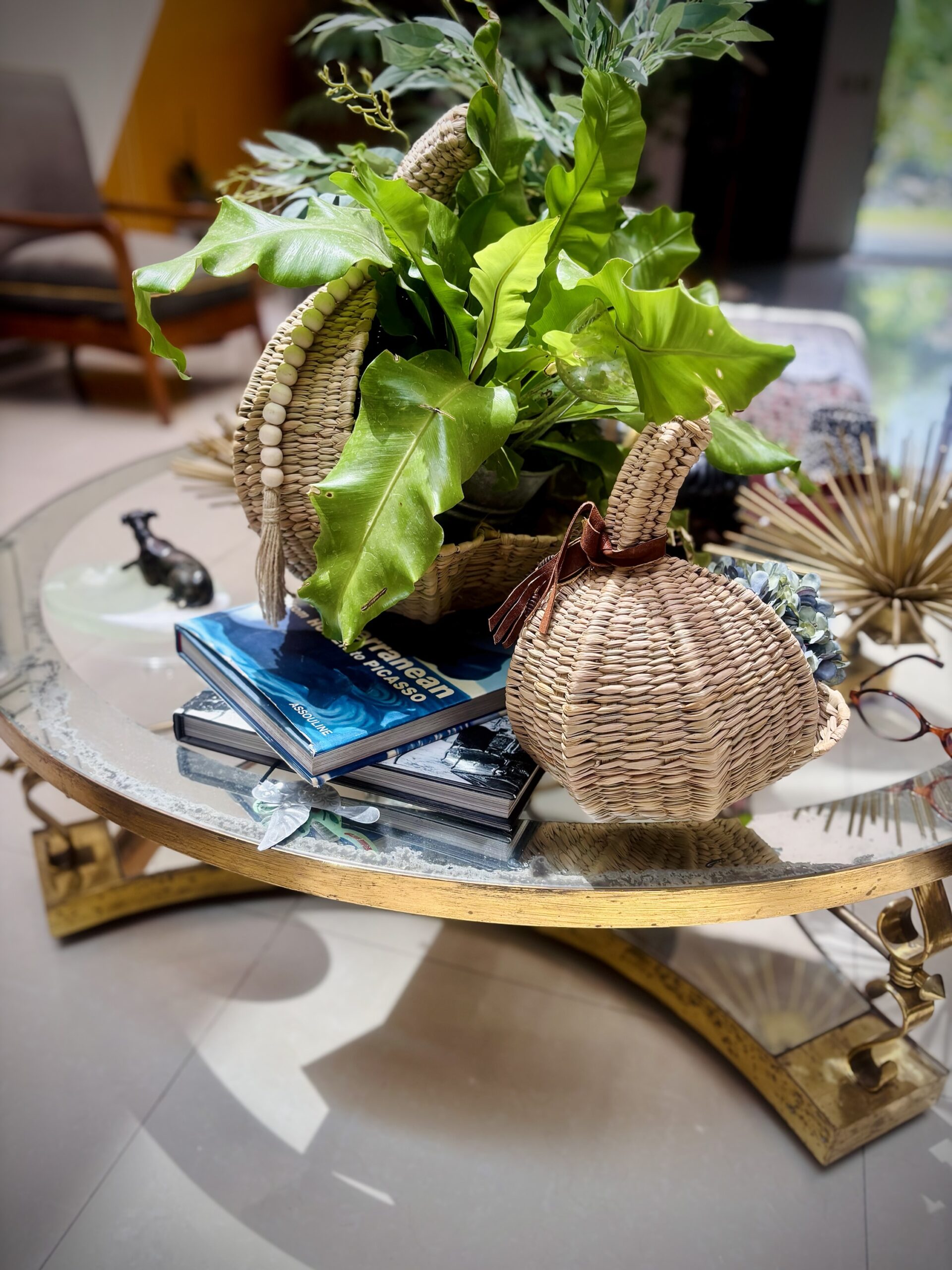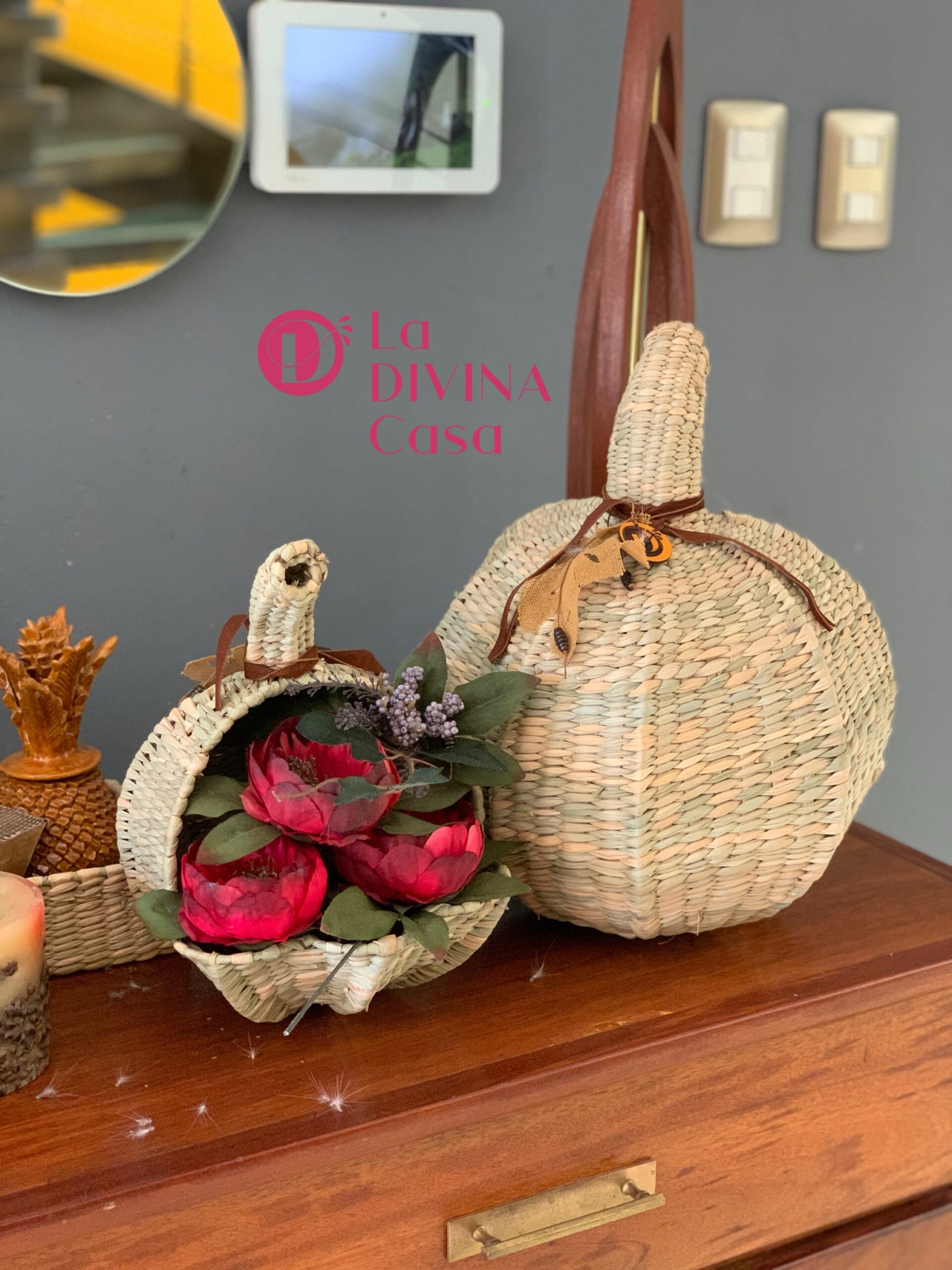 Calabazas tejidas a mano en trama de doble nudo en lirio silvestre endémico dé zonas lacustres de nuestro Mexico, con armazón de metal.