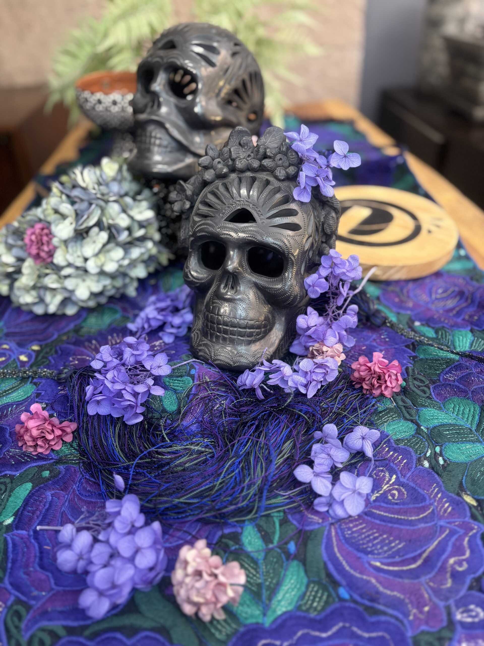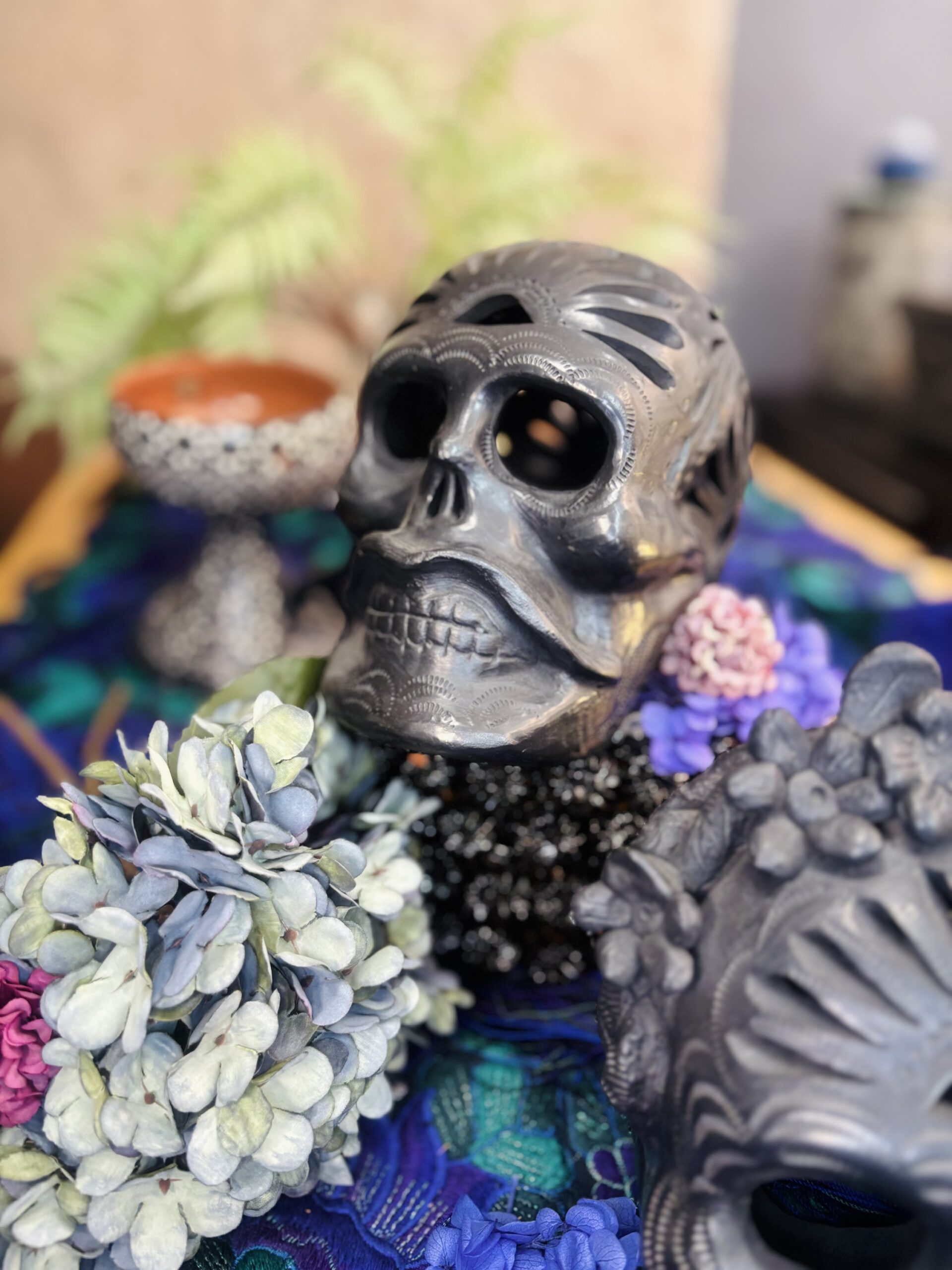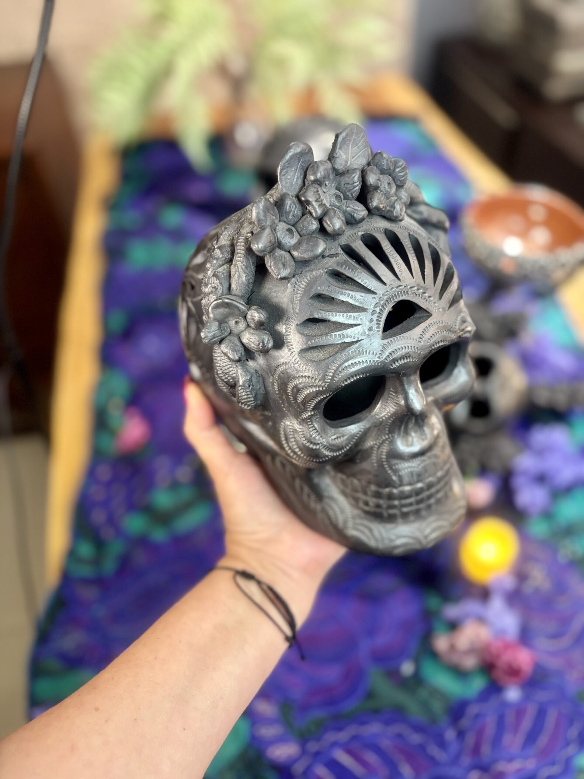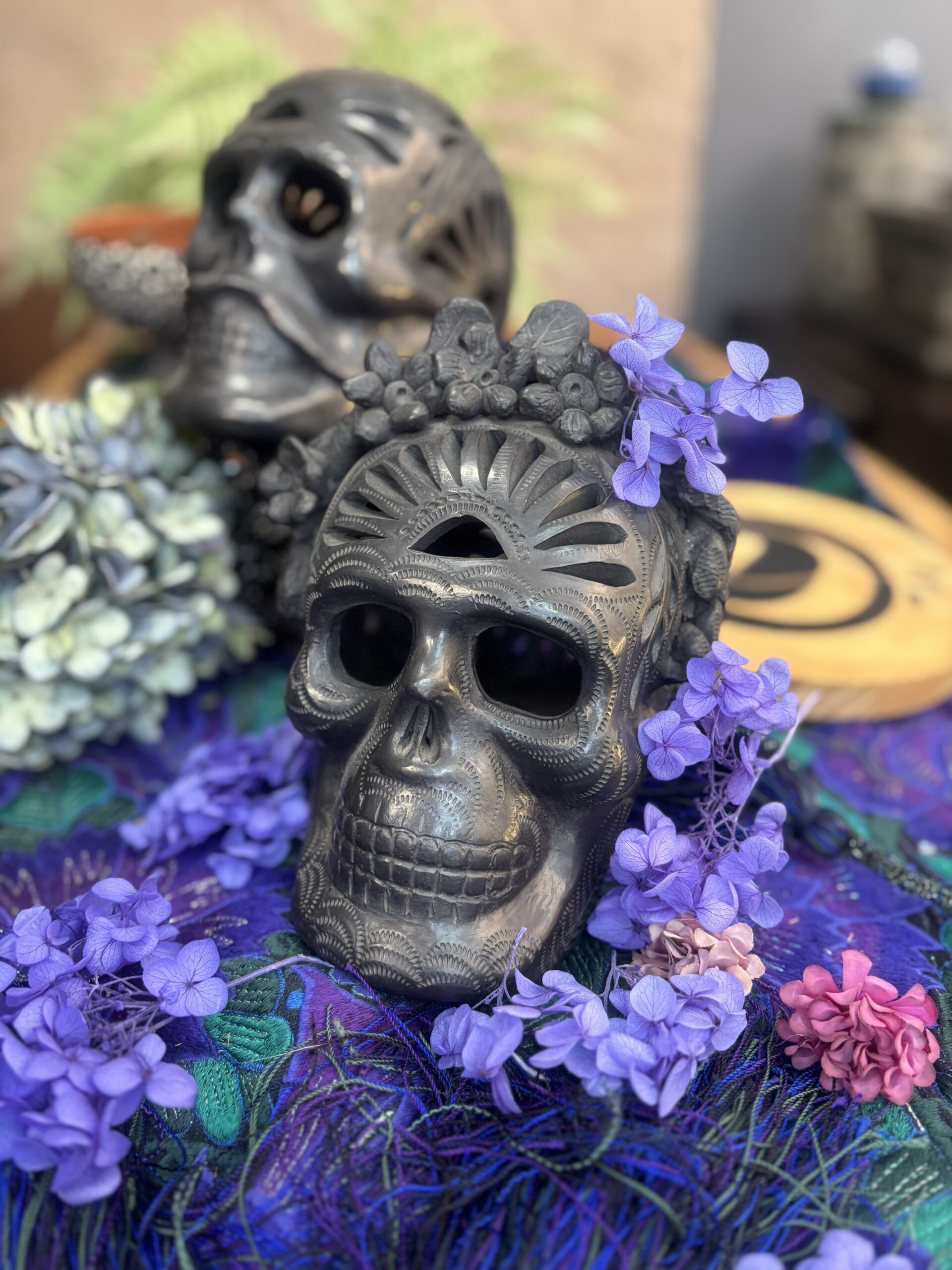 Juego de calaveras en barro negro bruñido hechas completamente a mano con dibujo de filigrana.