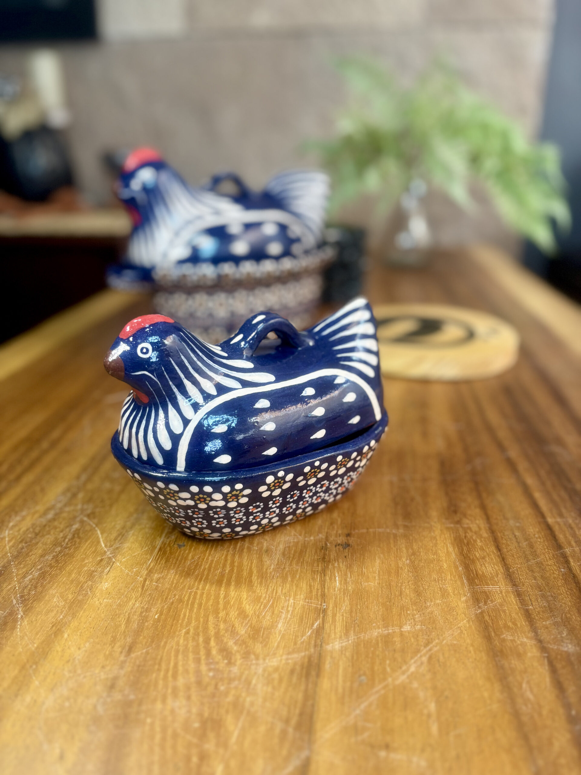 Hechos en técnica de Flor de Capulín, por artesanos purépechas pintada, puntito puntito formando patrones de bellas flores. Llevan una base de cazuela ovalada con su tapa en forma de gallina.