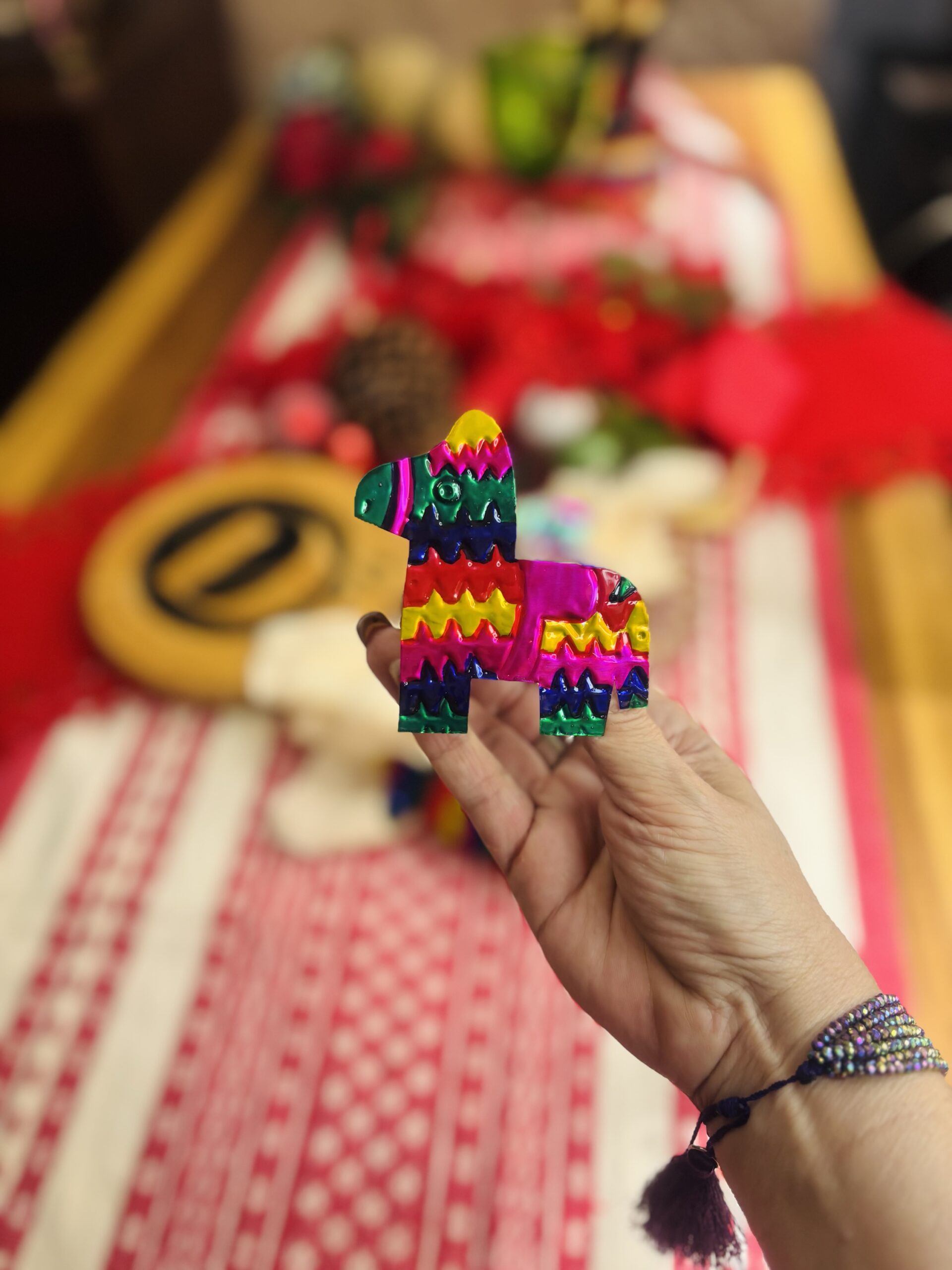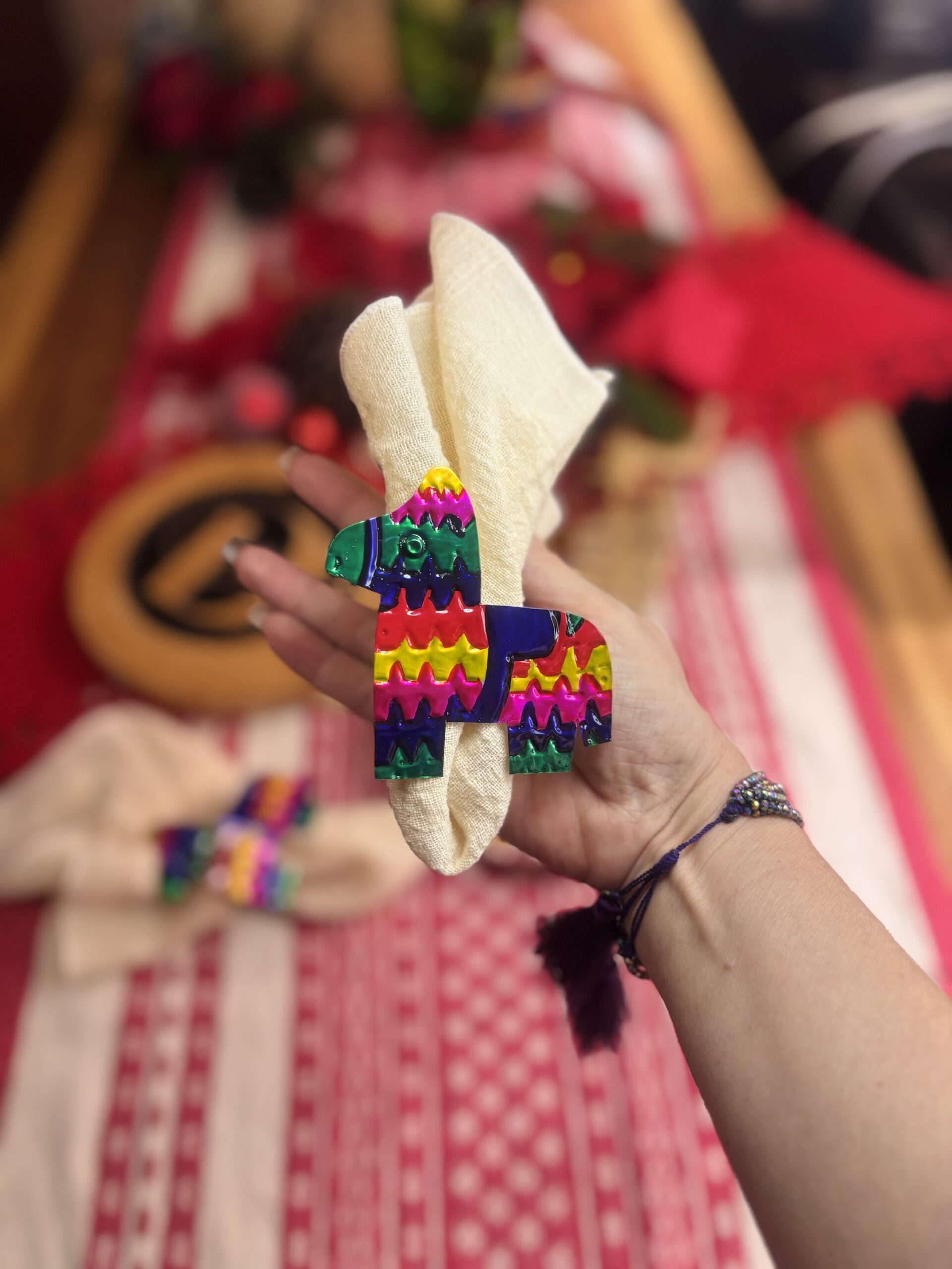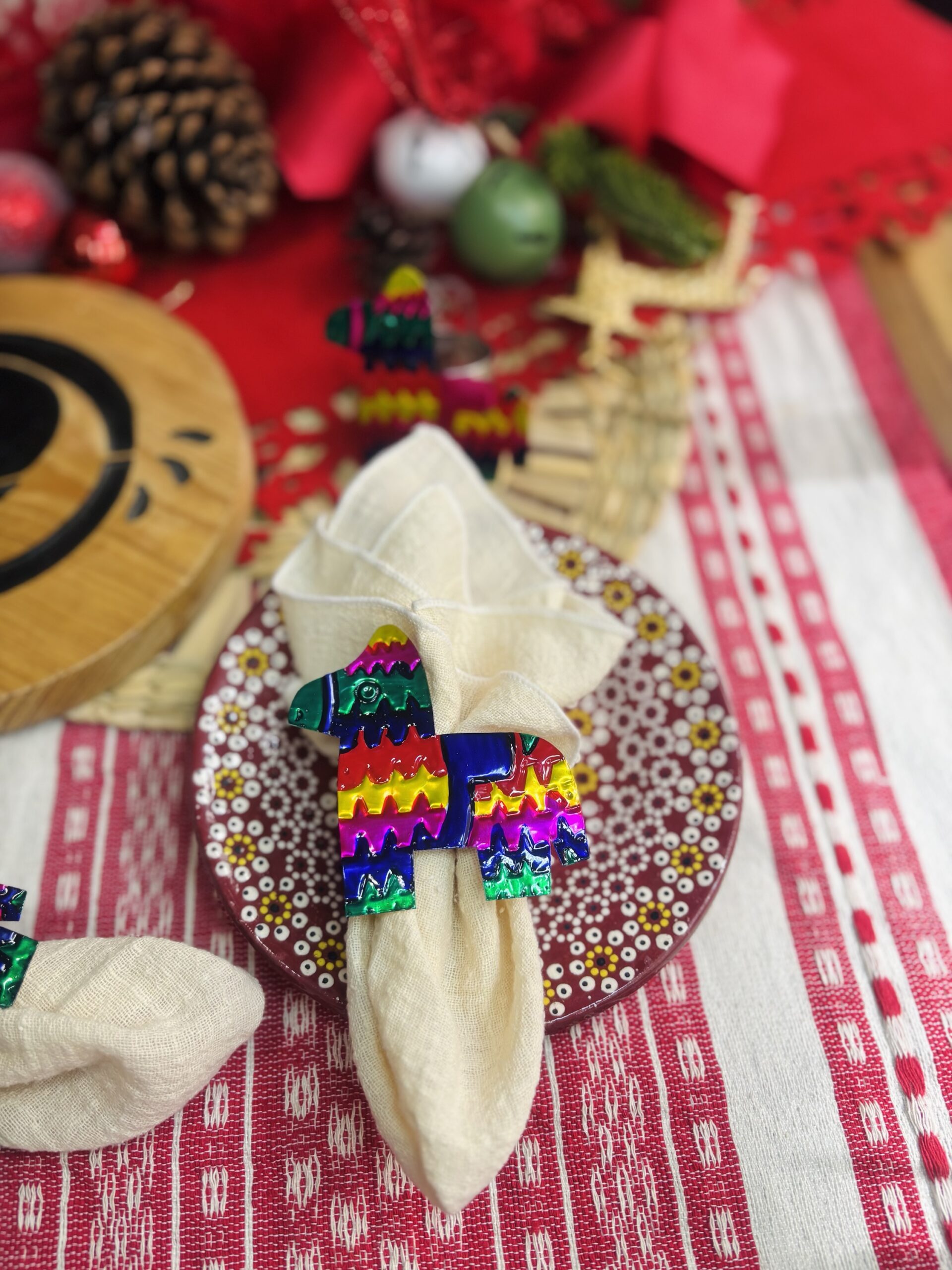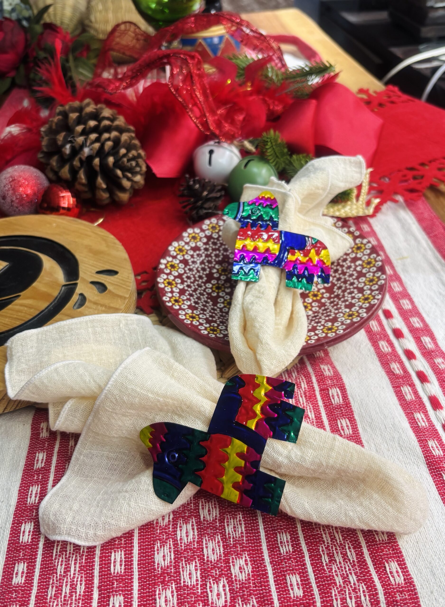 Juego de cuatro porta servilletas en forma de piñatas navideñas en hojalata repujada hechas a mano por artesanos mexicanos.