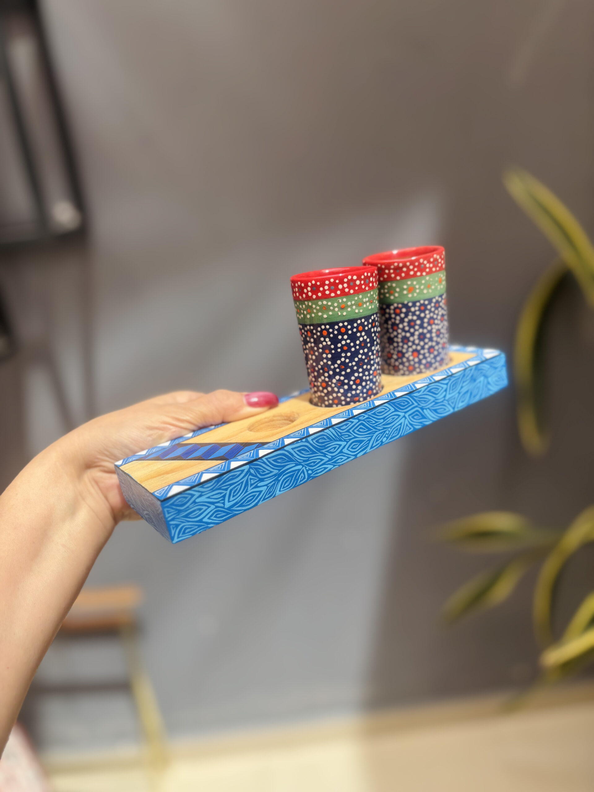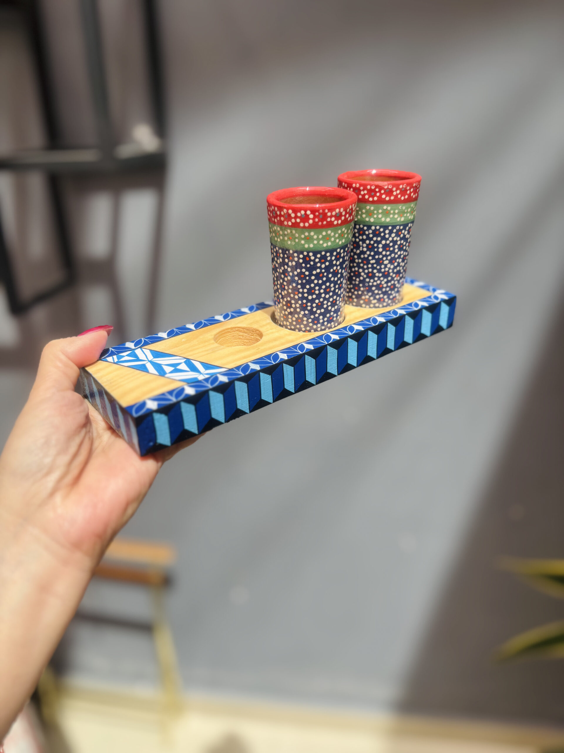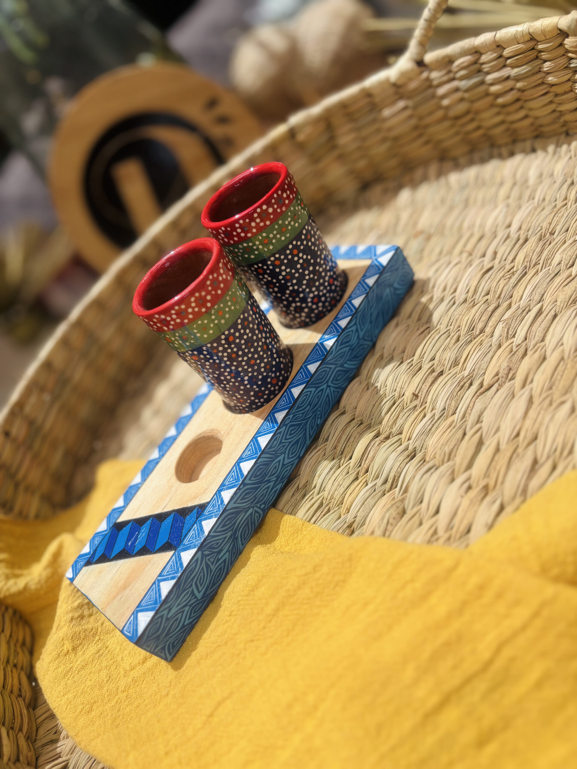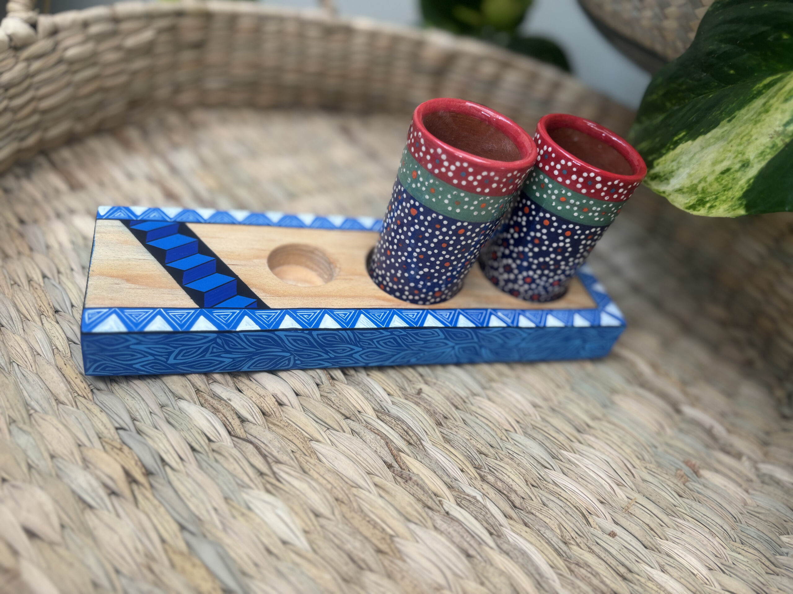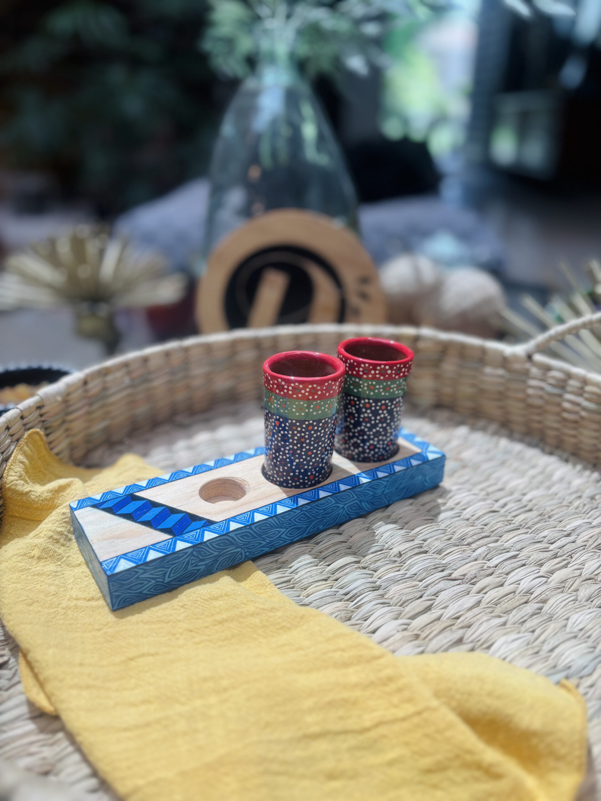 Juego de base de madera pintada a mano por artesanos oaxaqueños en técnica de Alebrijes y con dos tequileros hechos en Flor de Capulín por artesanos Michoacanos.